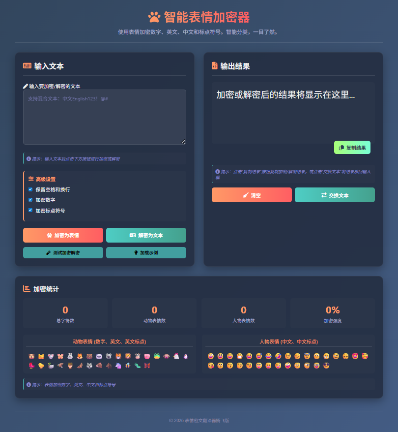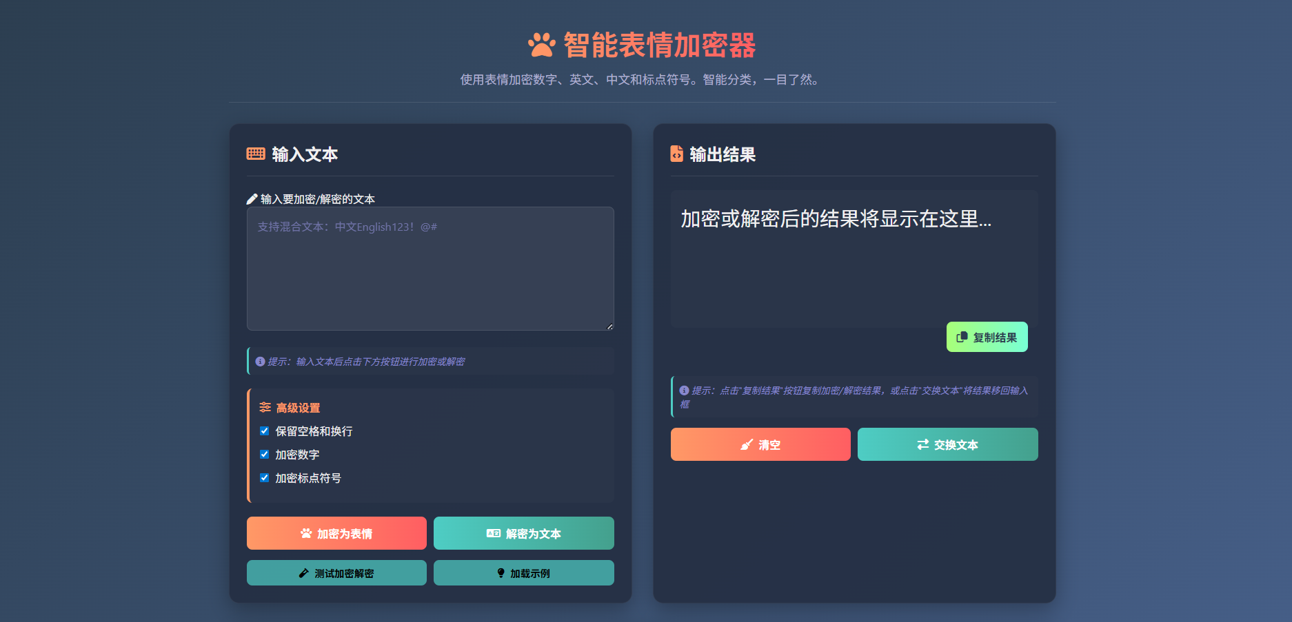 作用 :你可以输入一个自定义密码(如 123 )。设置密钥后,表情映射表会被打乱。 只有拥有相同密钥的人,才能解密出正确的内容 。这让它真正具备了“加密通讯”的价值。