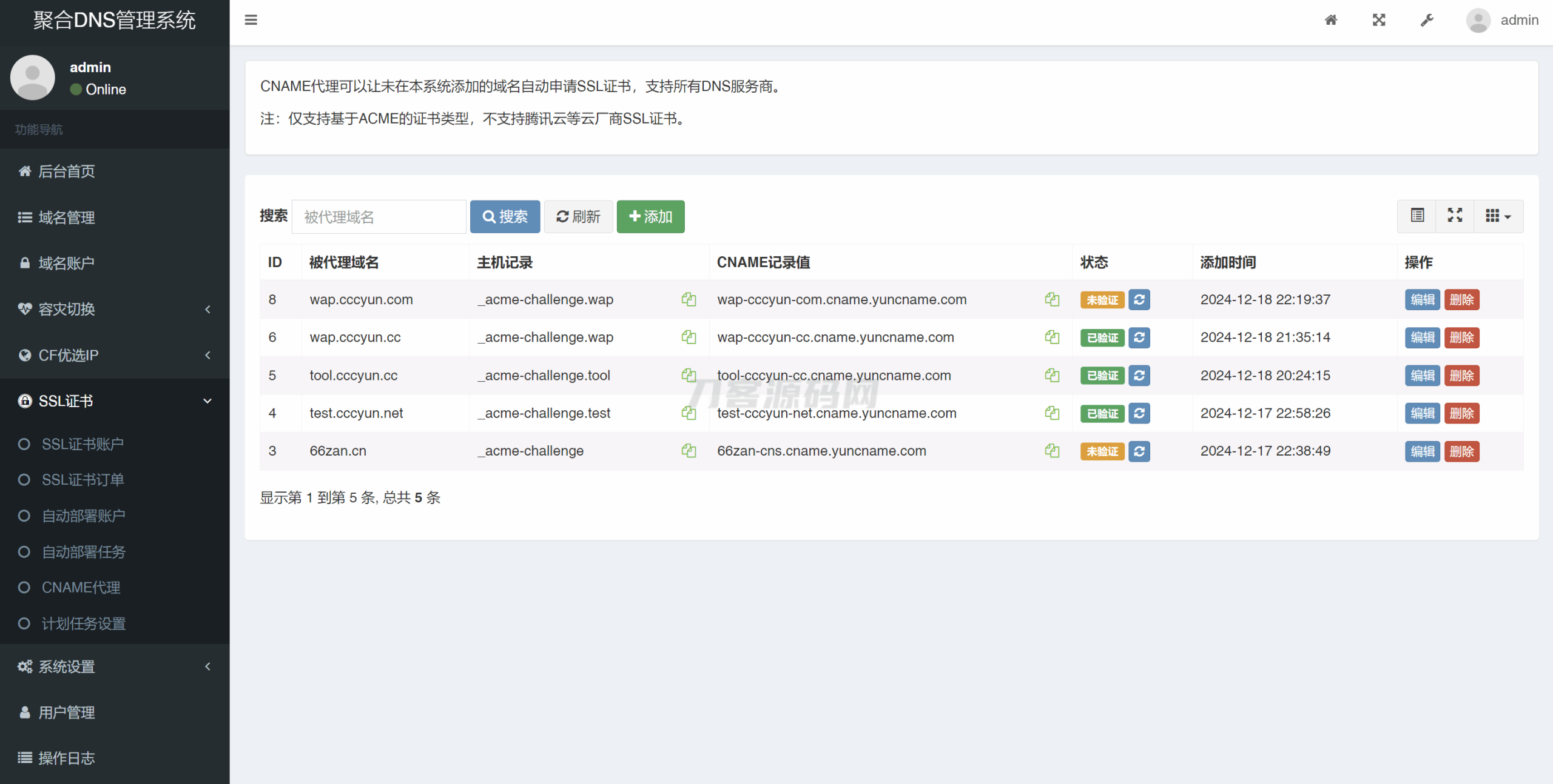 彩虹聚合DNS管理系统 V2.0.1 版本已更新,该版本新增SSL证书申请与自动部署功能,支持从Let's Encrypt等渠道申请SSL证书,并自动部署到各种面板、云服务商、服务器等,支持CNAME代理功能。