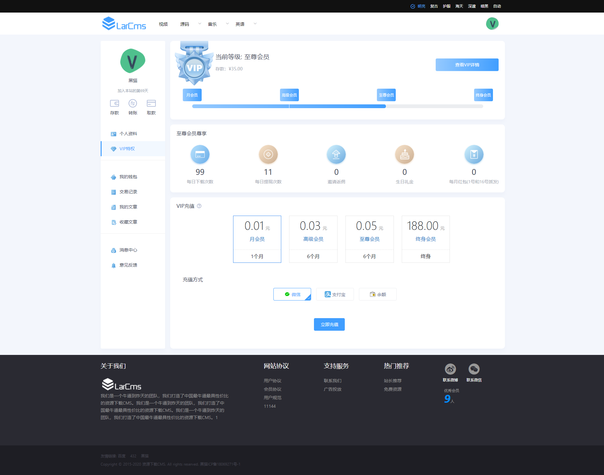Larcms历经1年完善,使用NUXT2+Laravel8前端后端分离全部100%开源,采用会员制度下载付费,集成支付宝微信等支付系统。