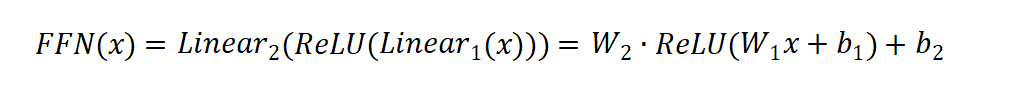 一个标准的 FFN 子层包含两个线性变换和一个非线性激活函数,中间通常使用 ReLU激活。其计算公式如下: