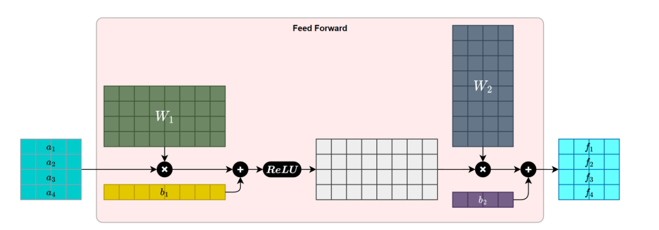 在自注意力层理清关系之后,这个子层会对每个位置的表示进行独立的非线性变换。它就像为每个词配备了一个私人定制的小型神经网络,专门负责: