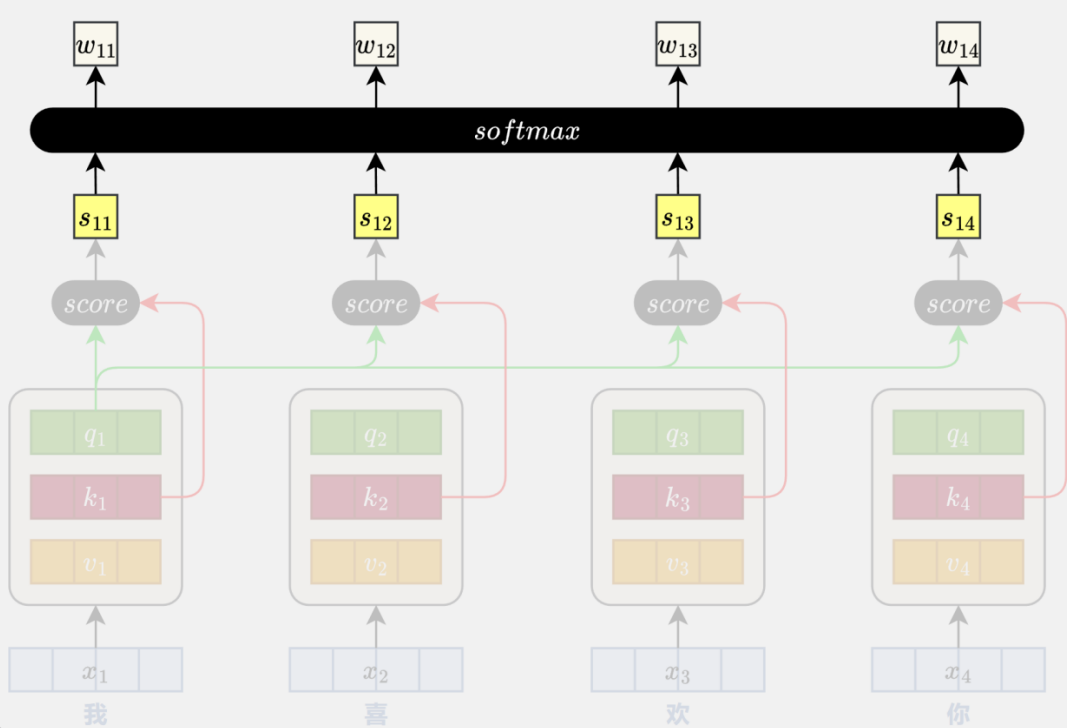 完成 Query、Key、Value 向量的生成后,模型会使用每个位置的 Query 向量与所有位置的 Key 向量进行相关性评分。