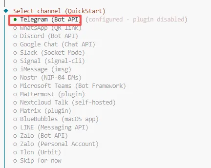 5.打开 Moltbot 的配置界面,选择 Telegram(Bot API) 作为消息通道,并将上一步获得的 API Token 填入对应配置项中,保存配置。