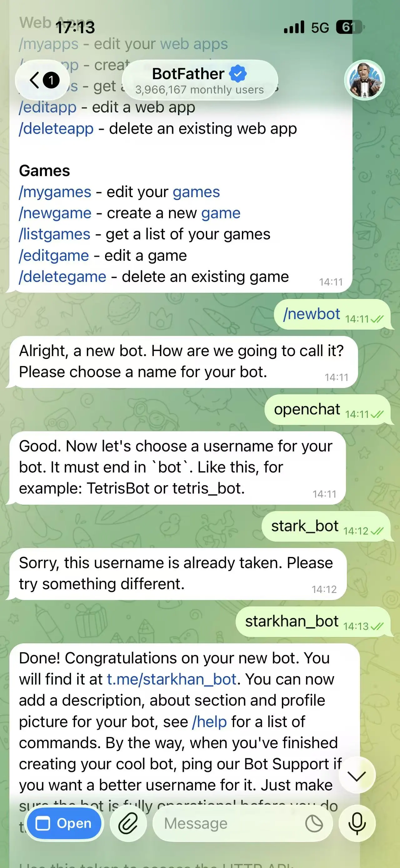 - 在对话中发送 /newbot 指令,用于创建一个新的 Telegram 机器人。1234567890:ABCdefGHIjklMNOpqrsTUVwxyz