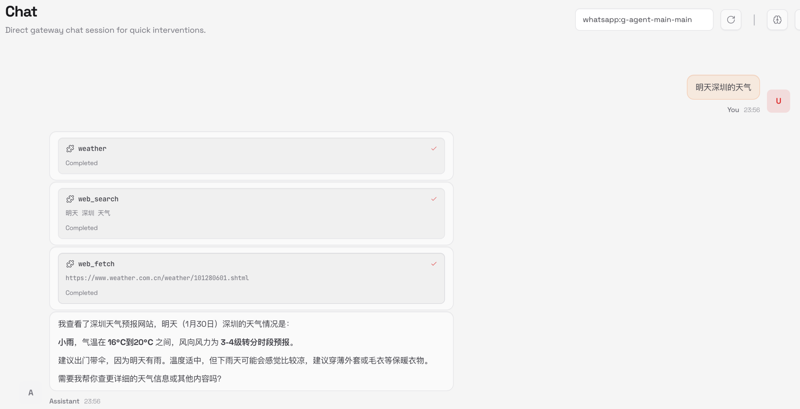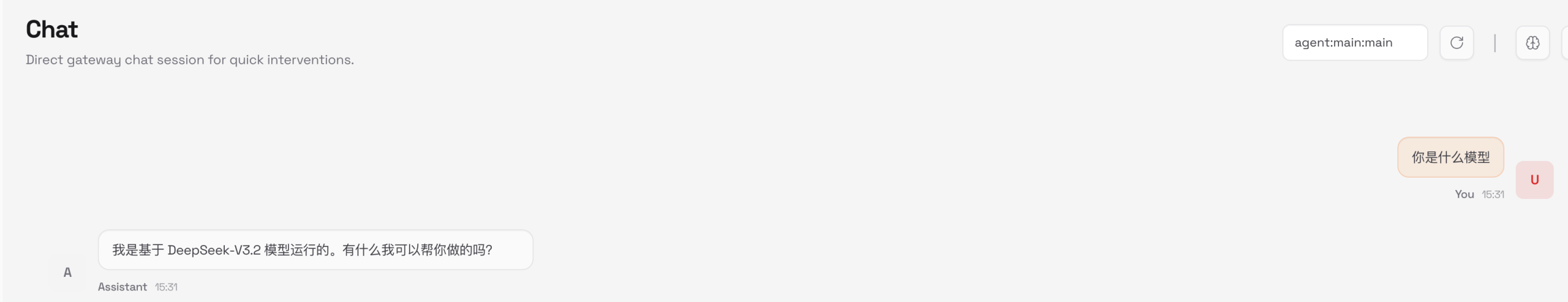 如果想在连通 discord、telegram 等聊天软件工具之前,先简单验证模型的调用返回,可以直接唤起 WebUI 界面开始聊天👇🏻