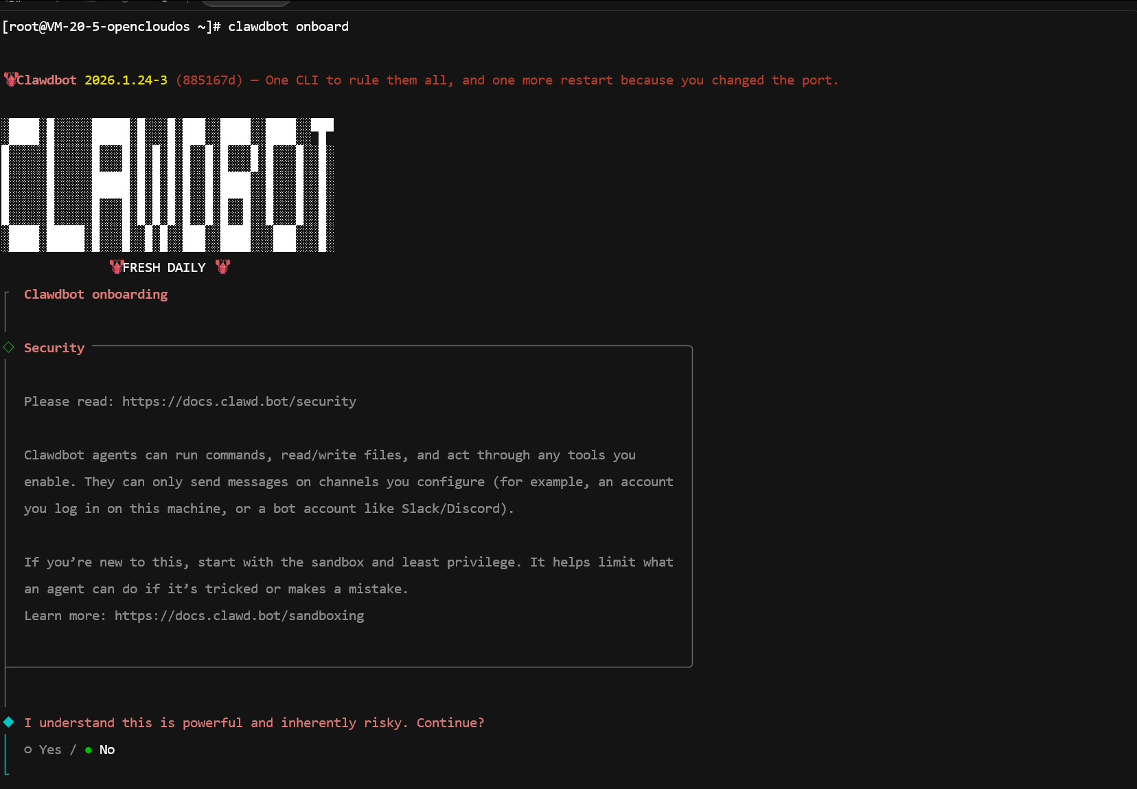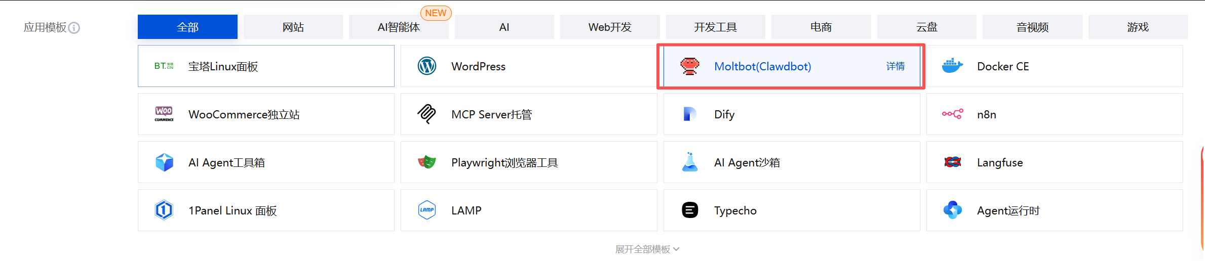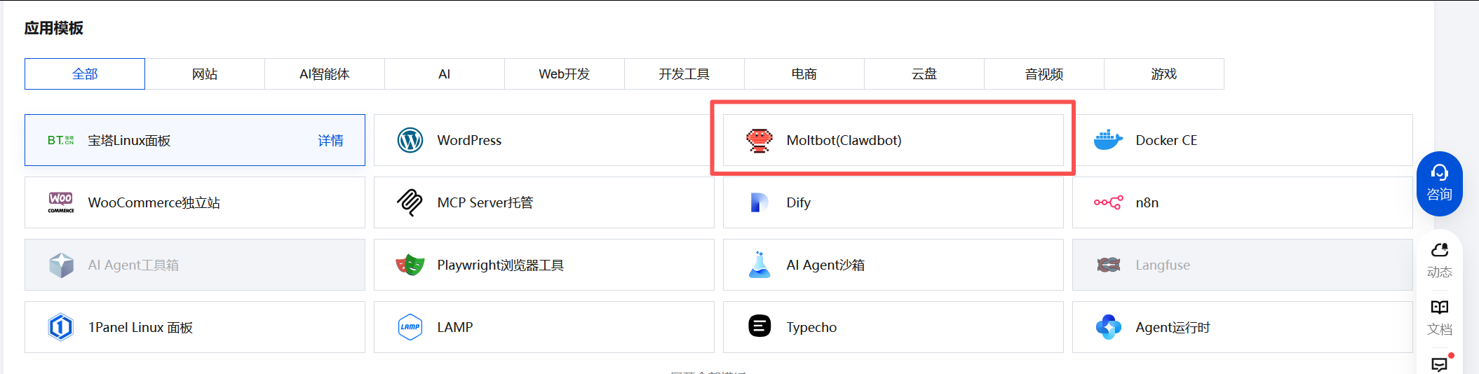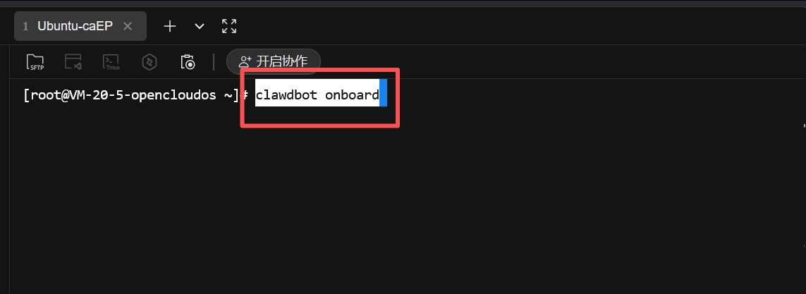 Moltbot(Clawdbot)与常见的应用模板不同,官方提供了若干需用户自行手动配置的步骤,在首次登入服务器后,输入并回车运行如下命令开始配置