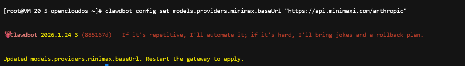 clawdbot config set models.providers.minimax.baseUrl "https://api.minimaxi.com/anthropic"