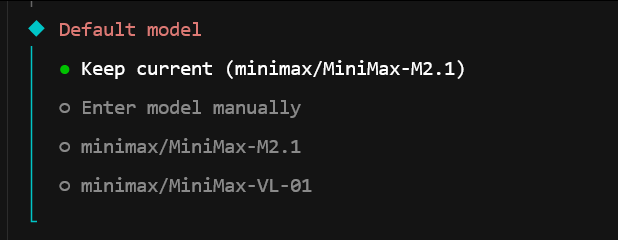 回车后提示Default Model (默认模型)这里让他默认选择MiniMax M2.1模型就行 不用管