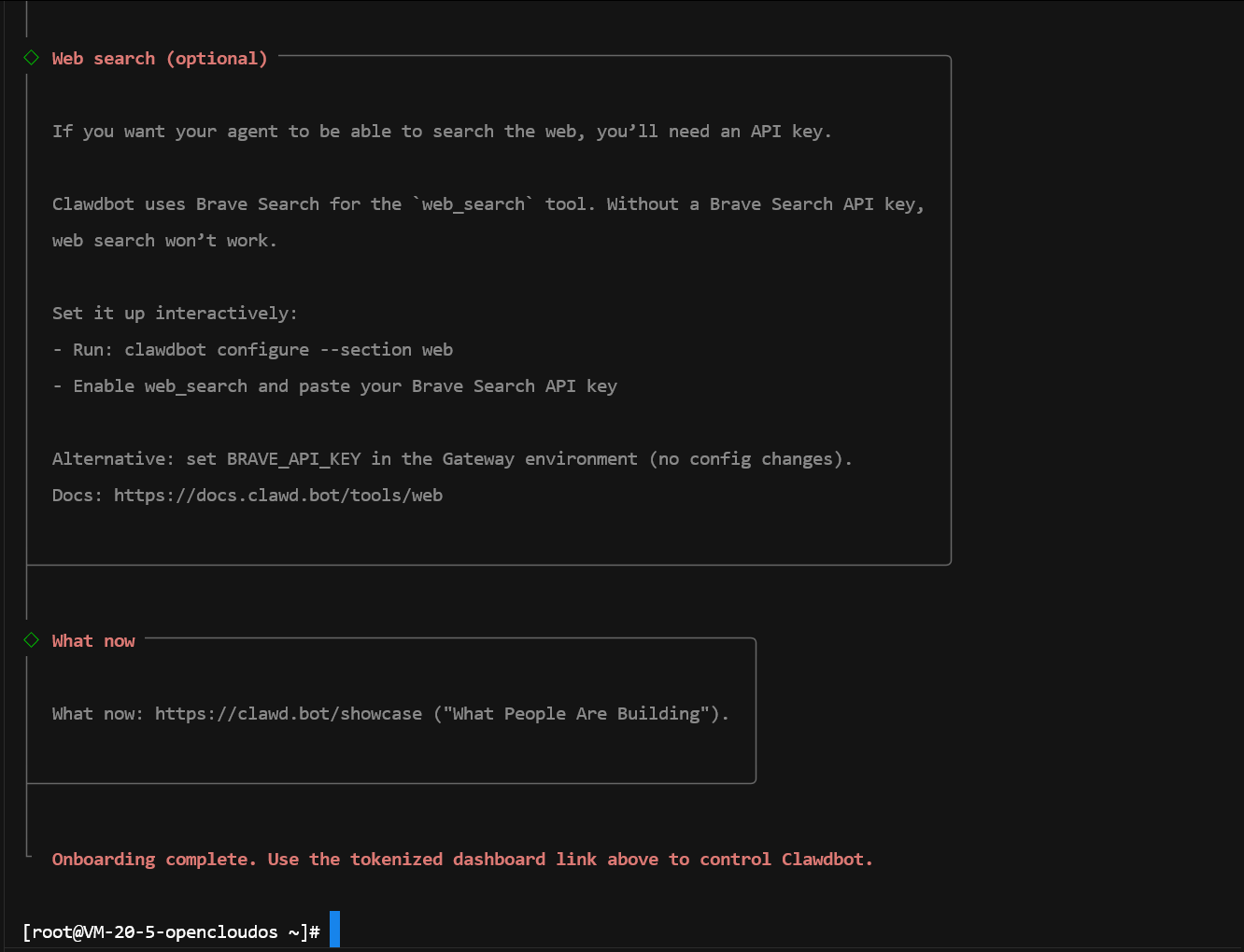 如果运行完这个脚本出现如下效果,那么说明配置成功了,这下你可以放心关掉执行命令的页面,尽情去和Moltbot(Clawdbot)聊天了!