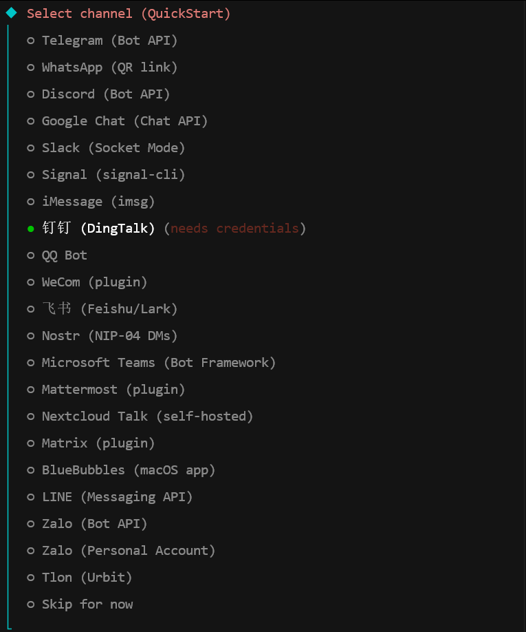 Select Channel(QuickStart)选择钉钉(DingTalk)