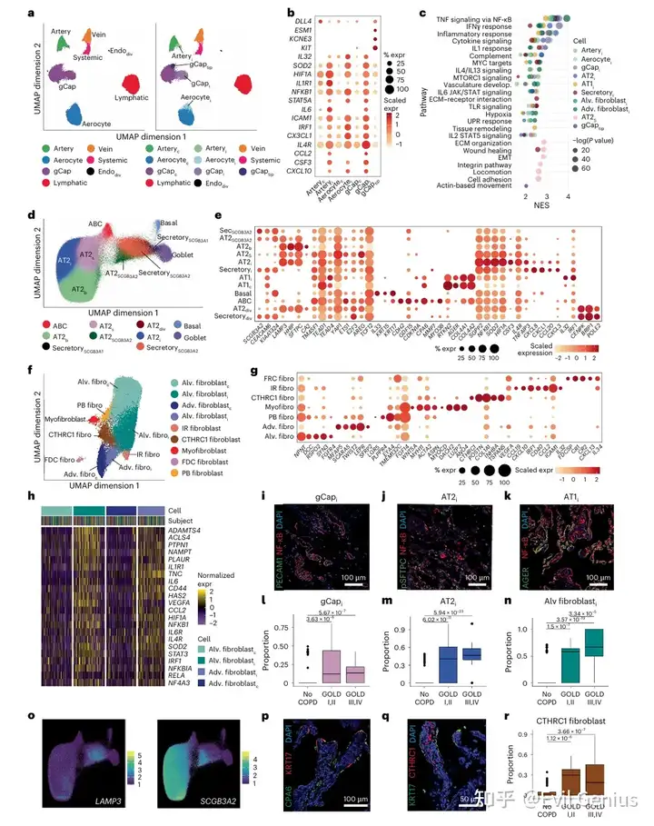 区域性成纤维细胞减少:包括支气管周围成纤维细胞(LGR5+)和肌成纤维细胞(WNT5A+),其比例随GOLD分期及肺气肿加重而下降