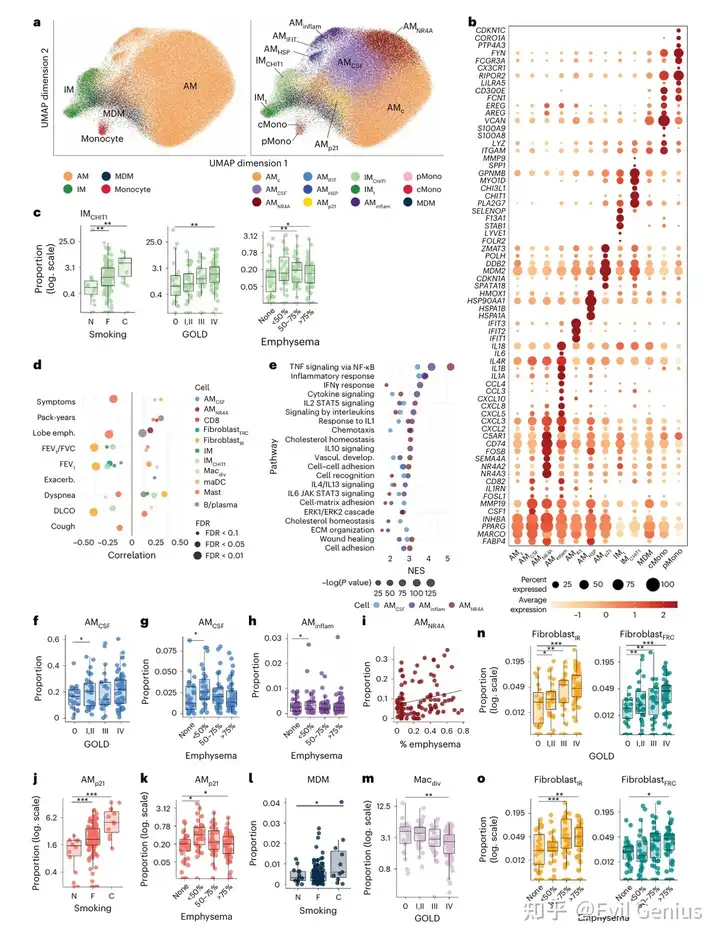 包括AMCSF1、AMNR4A与AMinflam,均显示细胞因子/趋化因子信号增强,分别与肺气肿、GOLD分期及急性加重不同程度相关