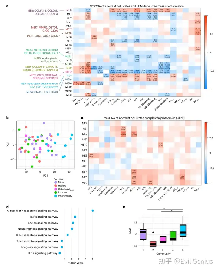 对匹配的脱细胞肺组织进行蛋白质组学分析,基于蛋白共现模式聚类为不同模块,并与异常细胞状态及临床表型进行关联