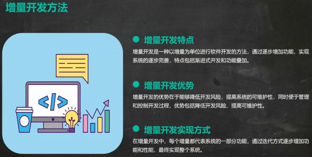 增量开发以“增量”为单位推进开发,通过逐步增加系统功能实现产品的渐进式完善。其核心特点是功能叠加和渐进式开发,优势在于能够降低开发风险、提高系统可维护性,同时便于对开发过程进行精细化管理和控制。在实践中,每个增量代表系统的一部分核心功能,通过迭代方式逐步扩展功能边界和性能水平,最终实现完整系统。