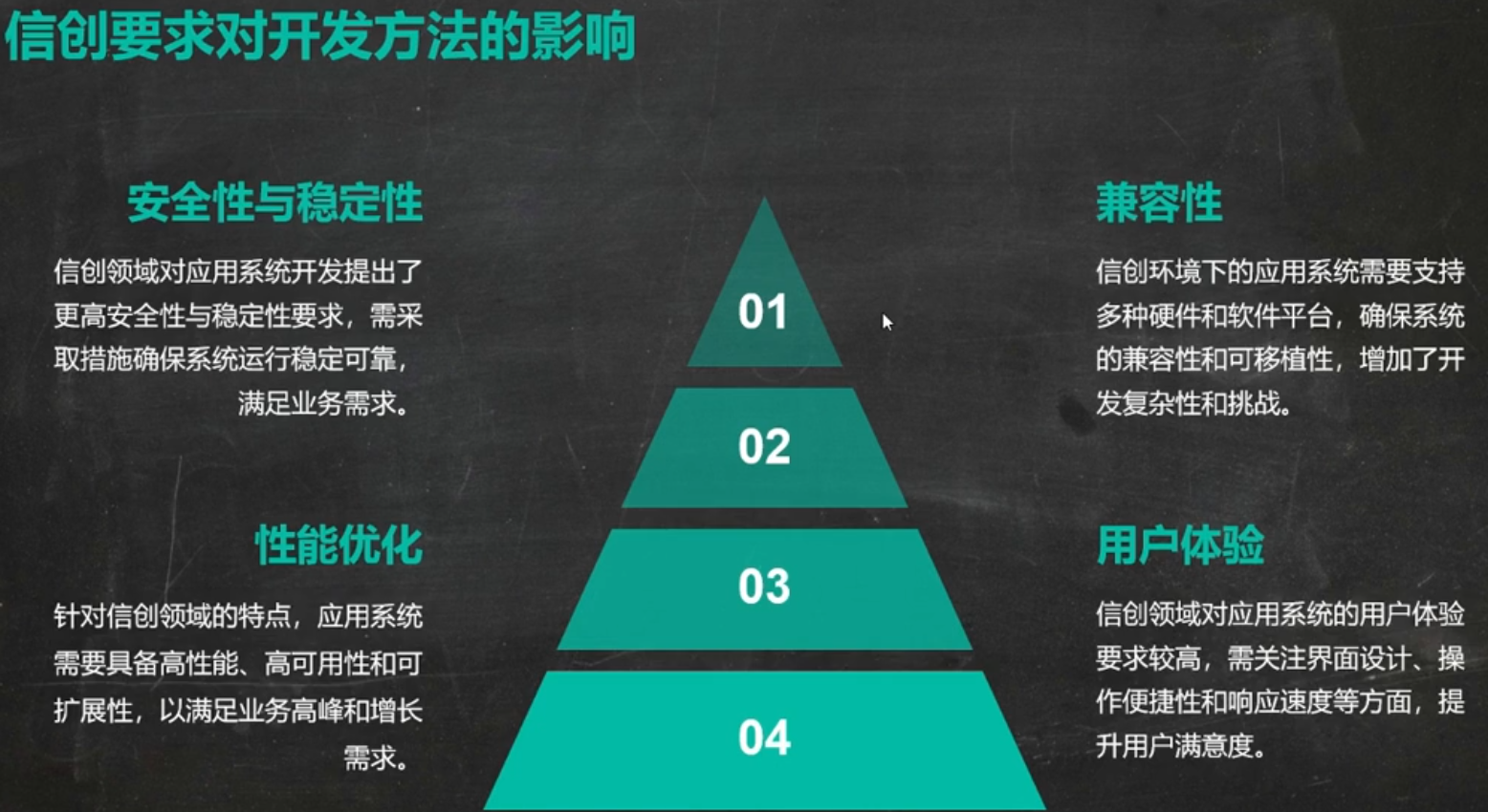 在信创项目中,开发方法还需额外兼顾安全性、兼容性、性能优化等特殊要求,形成适配信创环境的专属实践体系。