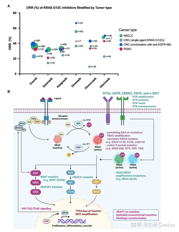 耐药机制:疗效受限的主要原因是EGFR介导的RAS/MAPK通路再激活。抑制KRAS G12C后,EGFR等受体酪氨酸激酶适应性上调,通过野生型RAS亚型激活旁路信号,导致快速耐药。