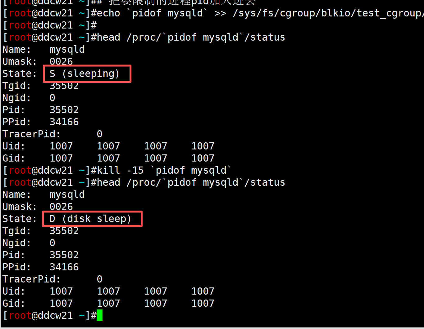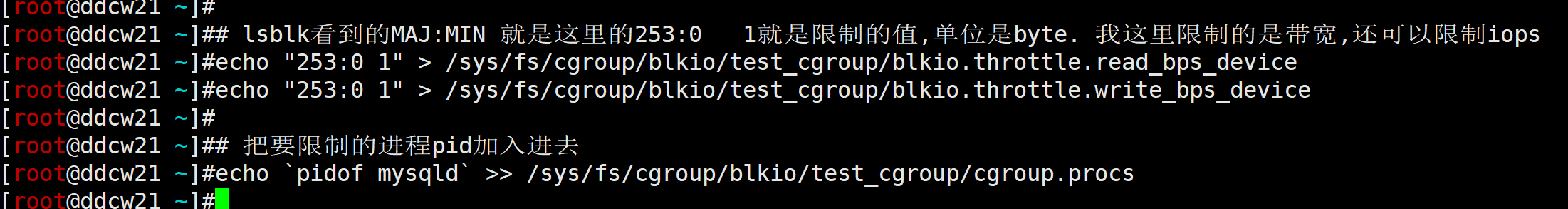 echo `pidof mysqld` >> /sys/fs/cgroup/blkio/test_cgroup/cgroup.procs