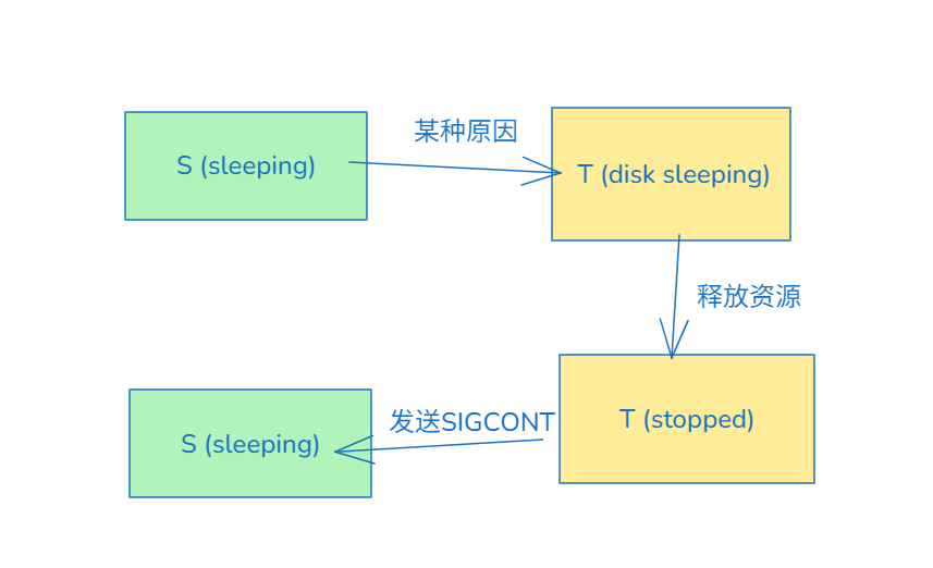 - 如果是T的话,就是被人暂停了(SIGSTOP),使用SIGCONT就能恢复.