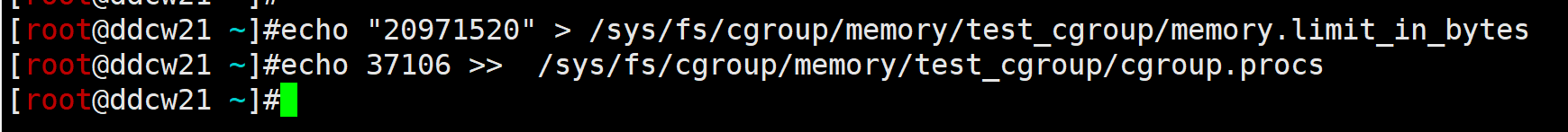 echo "20971520" > /sys/fs/cgroup/memory/test_cgroup/memory.limit_in_bytes