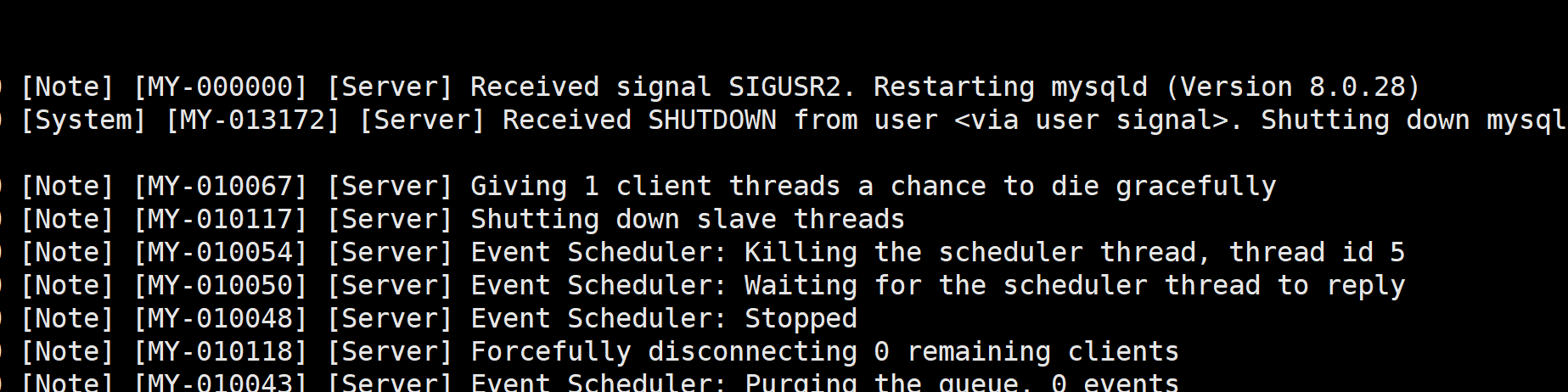 还真就重启了, 我们来看下mysqld日志呢: