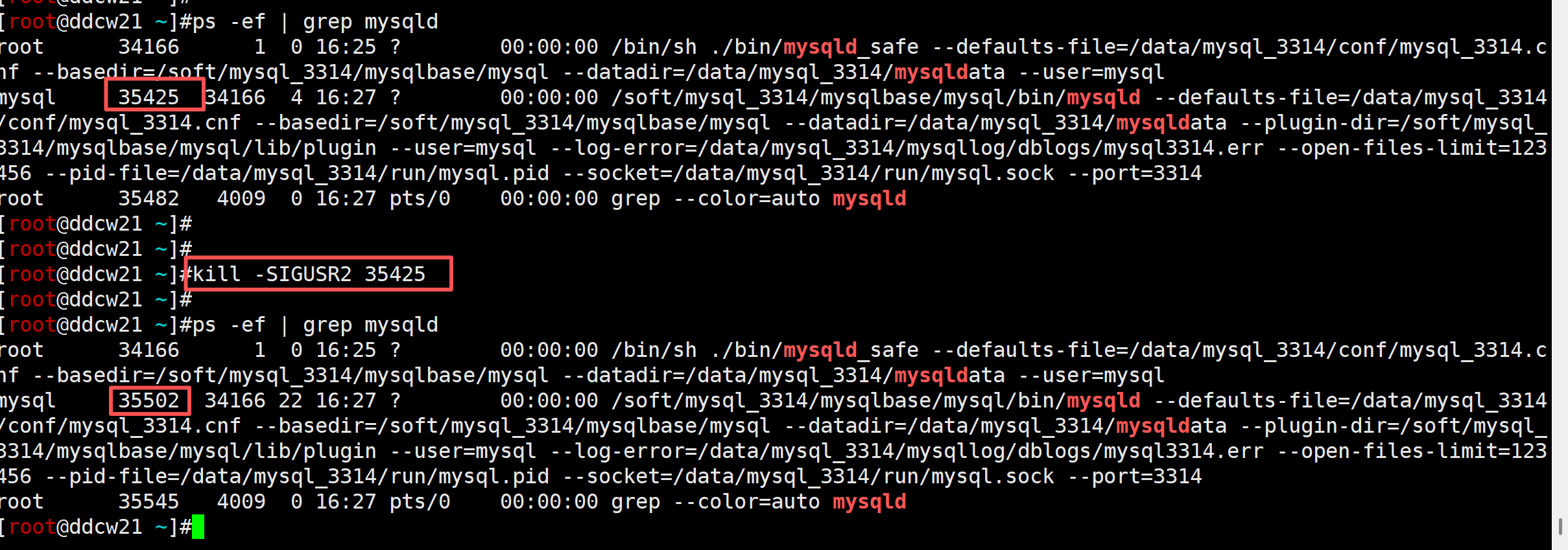 所以以后即使没有写重启脚本, 也能使用kill -SIGUSR2 mysqld_pid来实现重启mysql了, 还是比较方便.