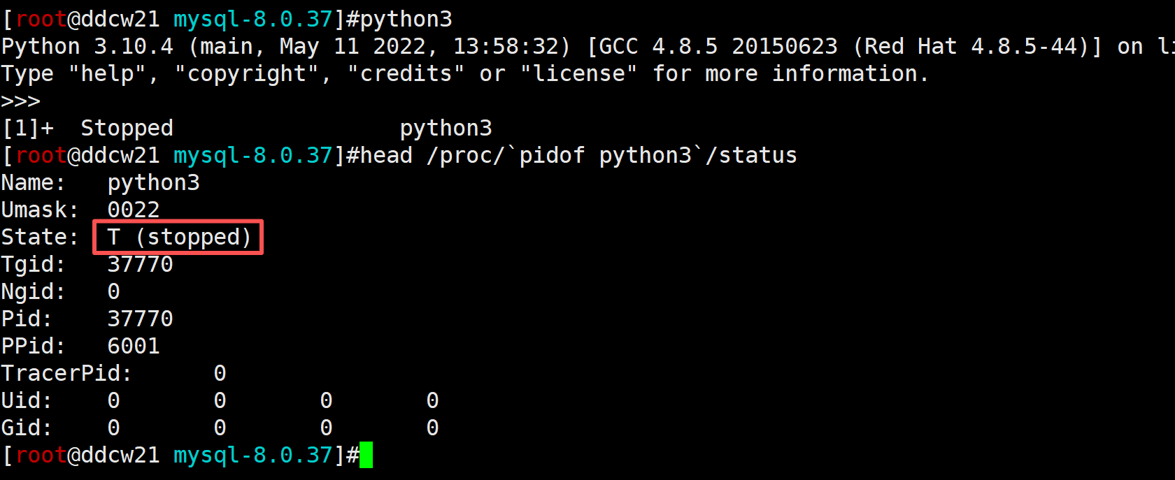 # 再观察主进程状态, 发现就变成了T (stopped)