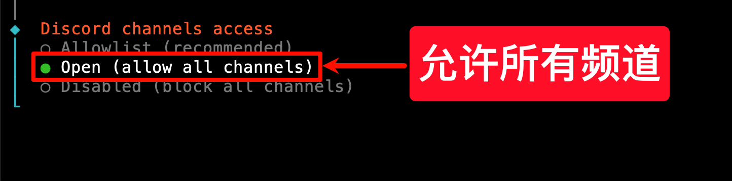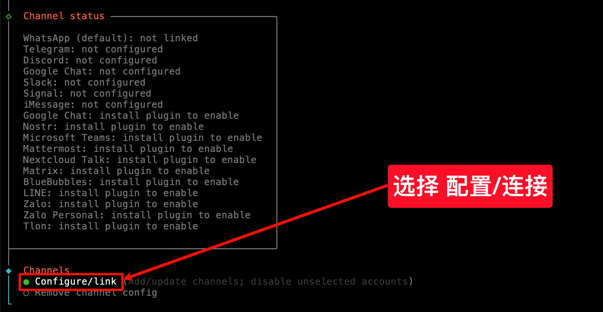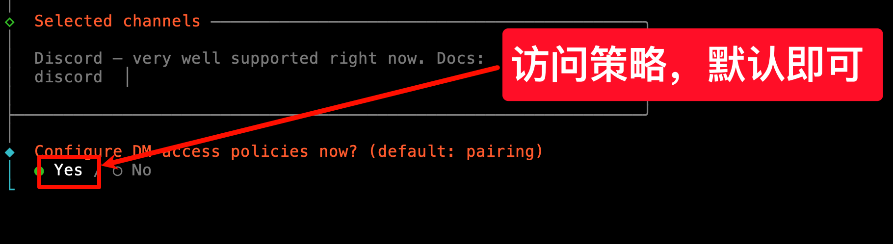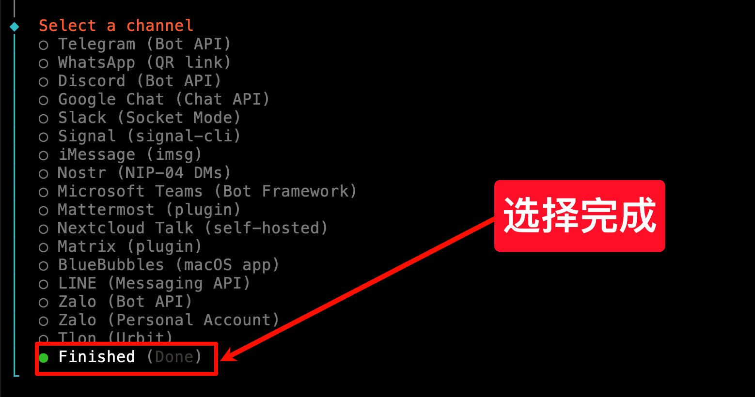 这里我们先选择跳过。本教程后续将使用 Discord 与 OpenClaw 通信。由于 Discord 配置稍显繁琐,后面会单独用一节详细讲解如何接入 Discord 机器人。你需要提前下载并注册好 Discord。如果觉得困难,也可选择飞书,详细配置可参考我上一篇文章