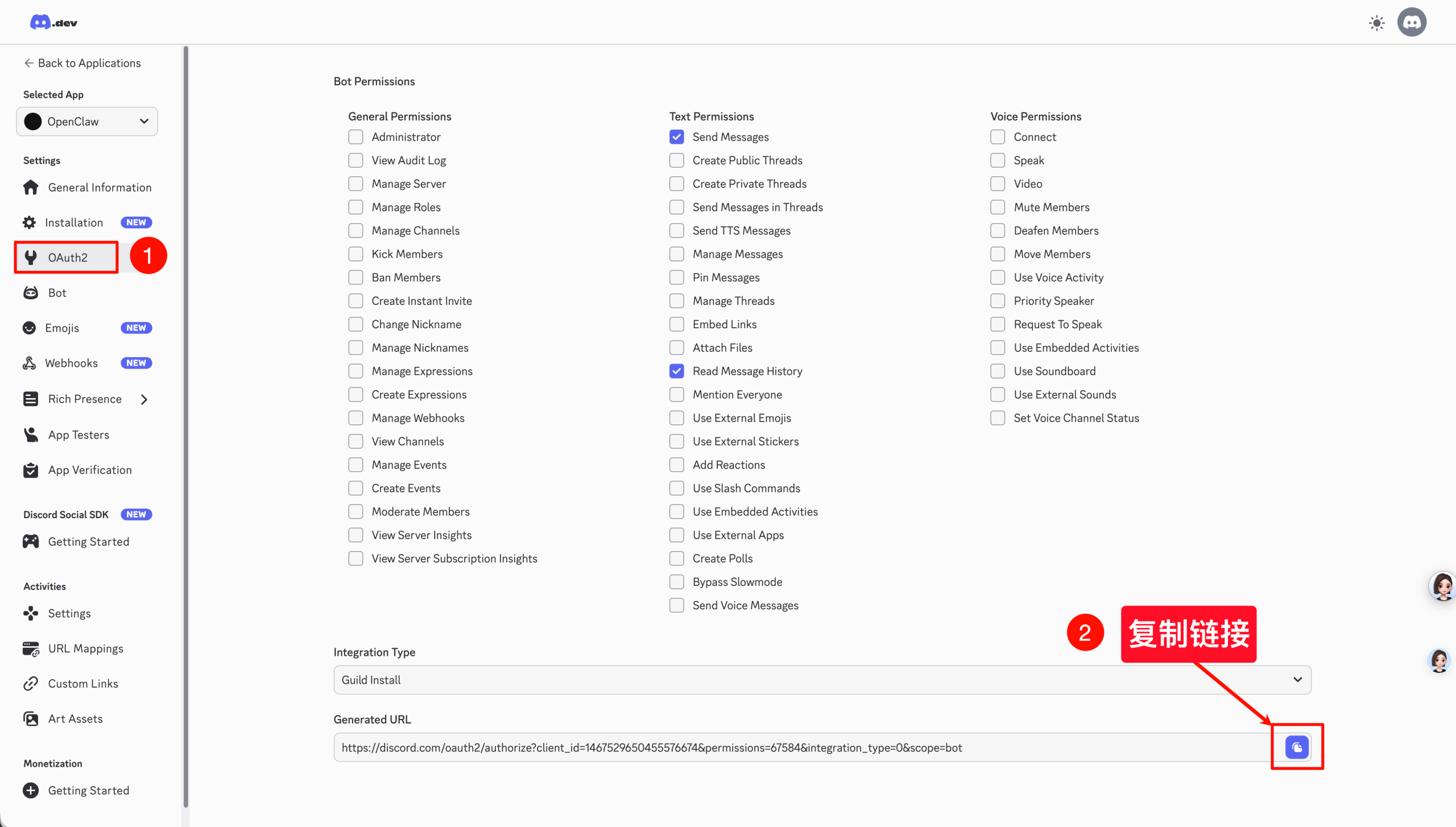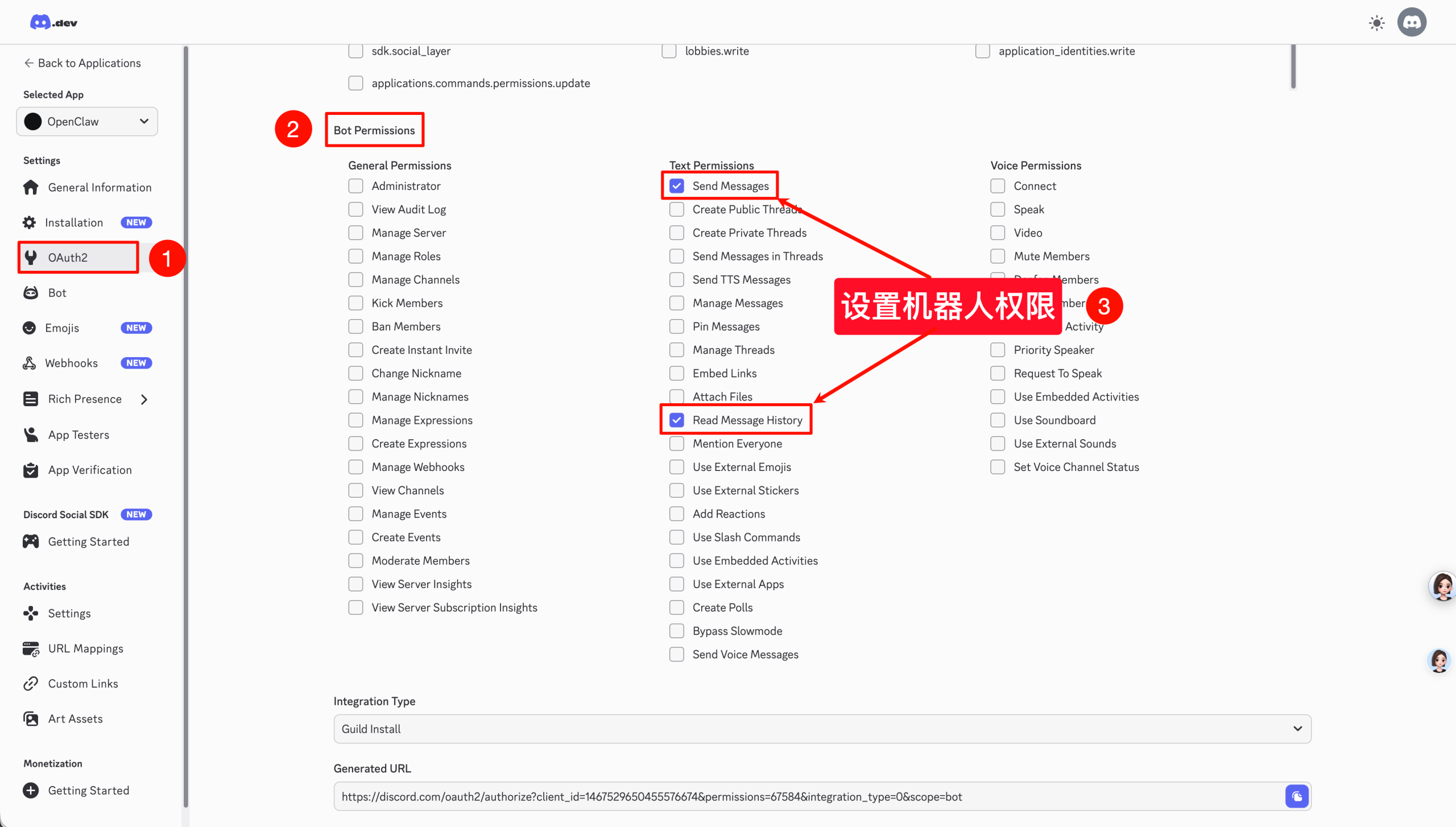 7. 进入 OAuth2 配置页面,勾选 Bot