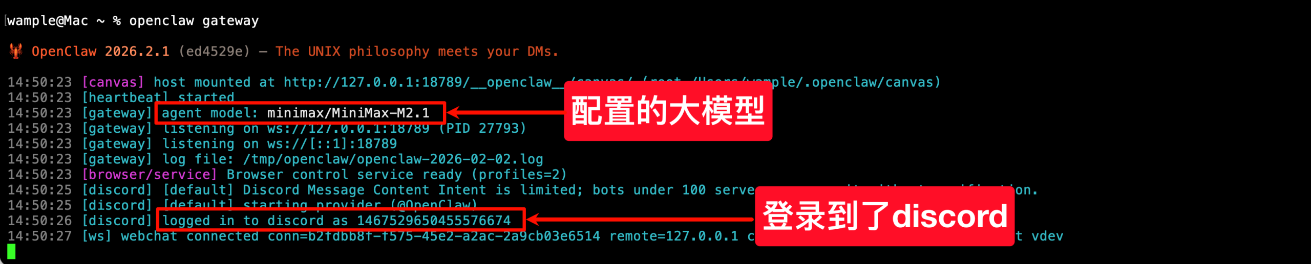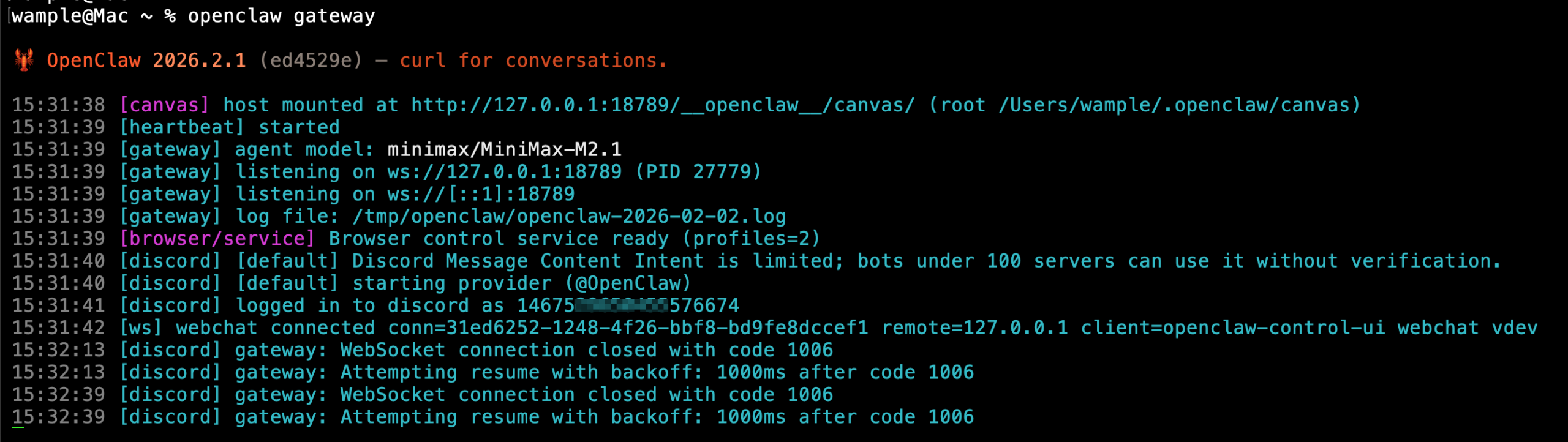 回到启动网关的命令行窗口,按下 Ctrl + C 停止服务,然后重新启动: