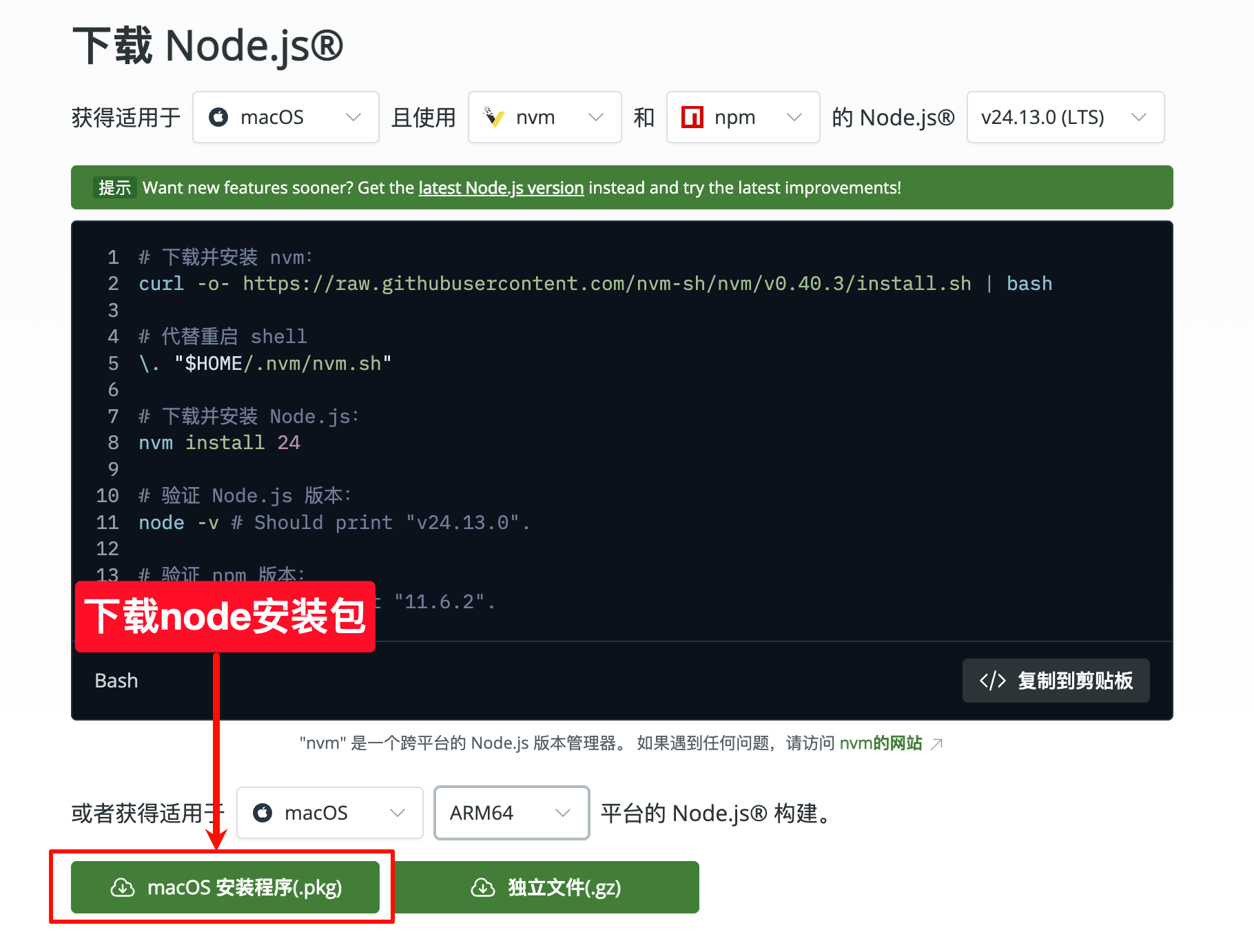 - 下载 LTS 版本(推荐 22.x 或更高)