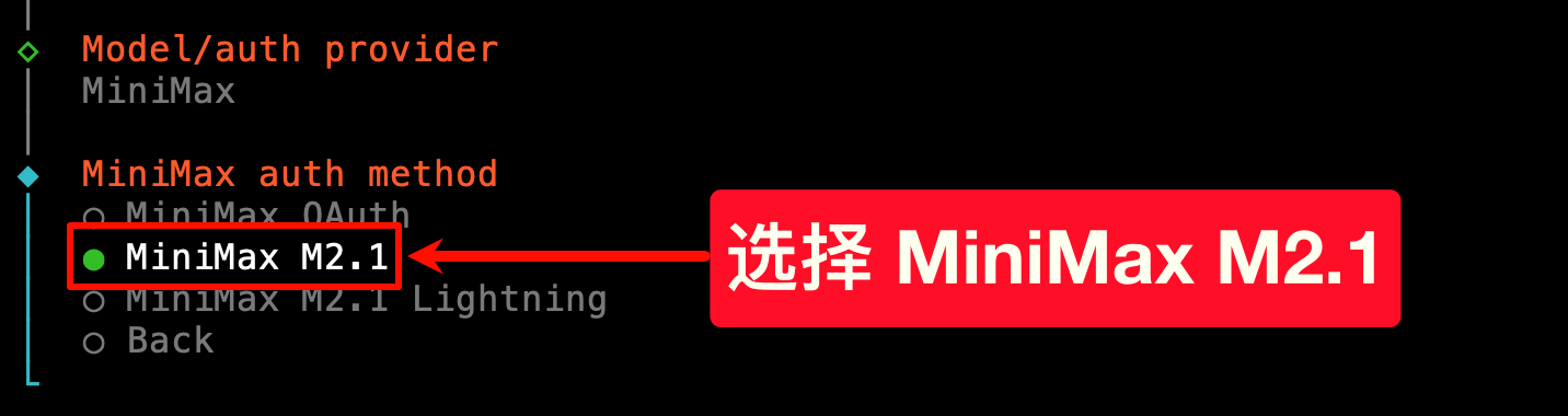 OpenClaw 需要连接 AI 模型才能工作。国内推荐使用 MiniMax M2.1。
