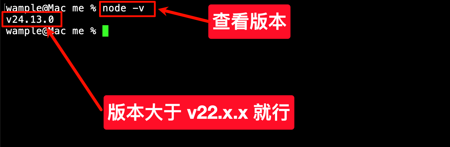 预期输出:显示版本号,只要高于 v22.x.x 即可。