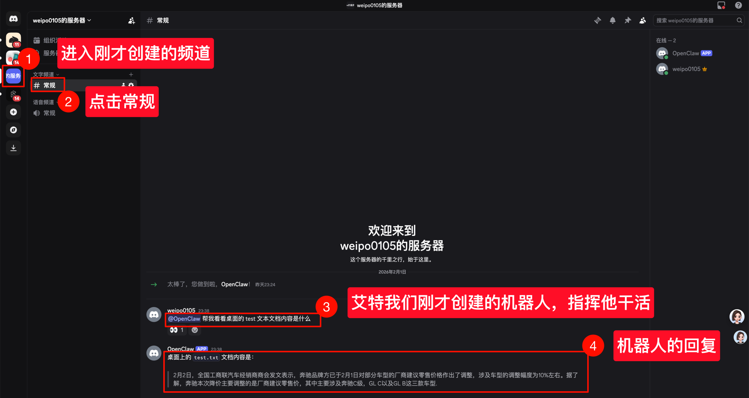 至此,OpenClaw 已成功与 Discord 打通。现在你可以在 Discord 中通过与 Bot 对话的方式,指挥 OpenClaw 操控你的电脑了!