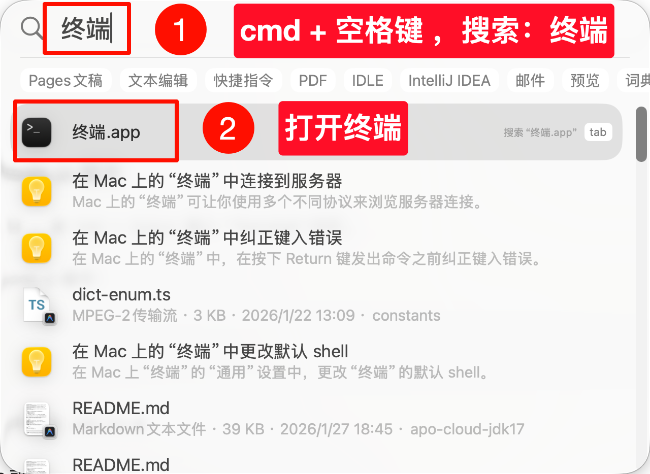 打开 终端(Terminal),按 Cmd + Space 输入 “Terminal” 并回车。