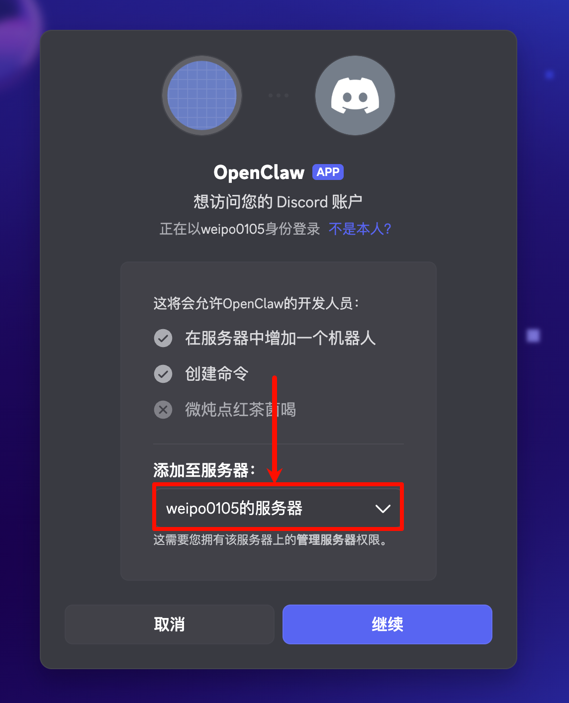 在浏览器中打开刚才复制的链接,选择一个服务器(相当于将创建的机器人加入该服务器),选择前面创建的自定义服务器。