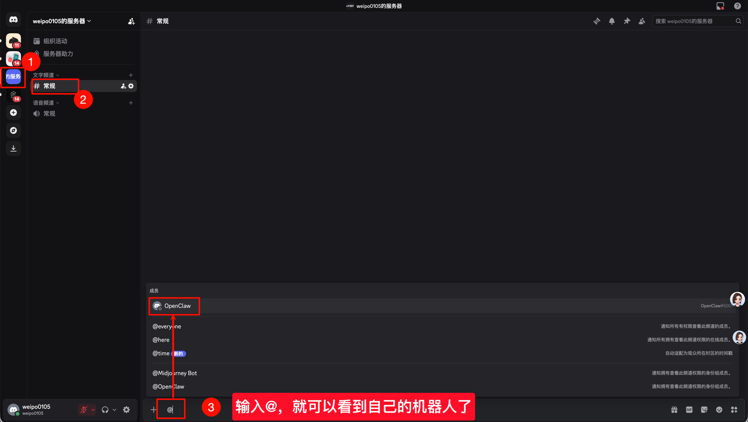 回到 Discord 创建的频道,点击右上角的“显示成员”,可以看到当前频道成员。点击我们添加的 Bot:OpenClaw。