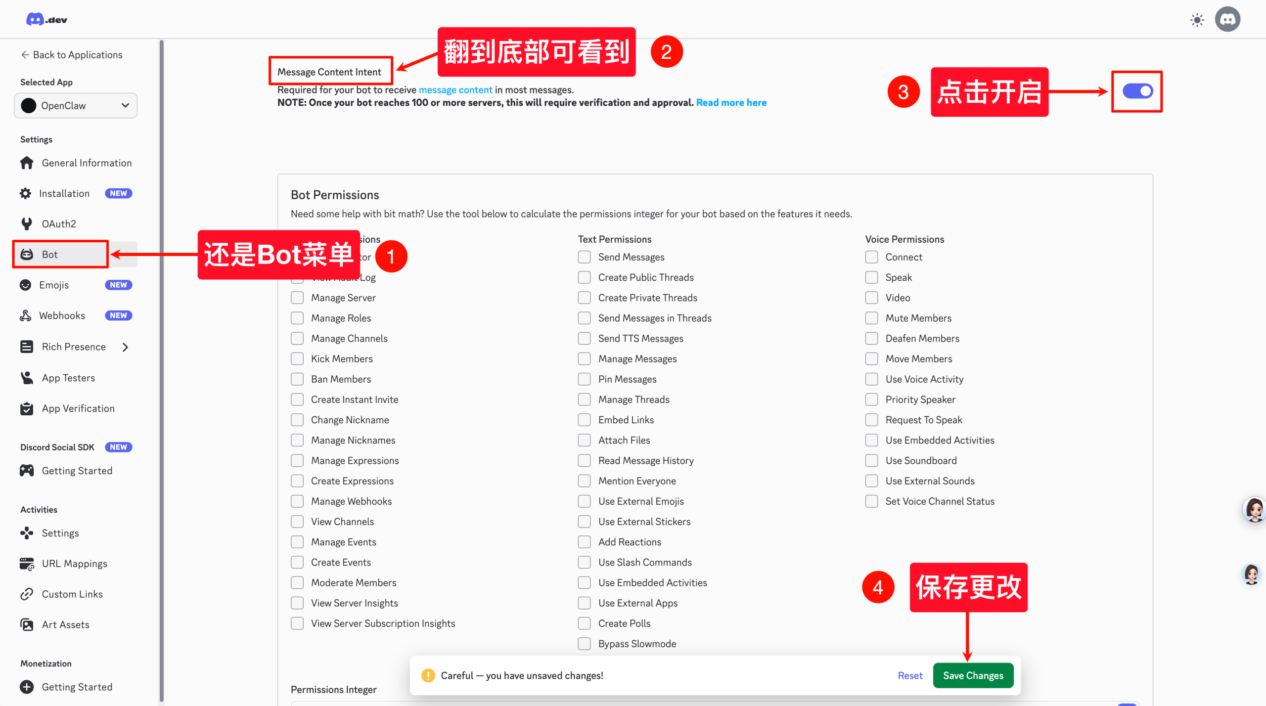 6. 在当前页面继续向下滚动,找到 Message Content Intent 并启用