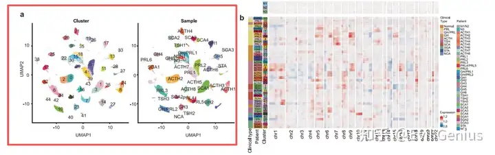 为了在单细胞水平上进一步研究垂体神经内分泌肿瘤(PitNET)的肿瘤细胞特征,在整合所有样本时未使用Harmony等可能过度均一化肿瘤异质性的批次效应去除算法,从而进行了无监督聚类分析。单细胞RNA测序(scRNA-seq)数据共鉴定出45个不同的细胞cluster。除cluster 39包含来自多个样本的增殖肿瘤细胞外,大多数细胞cluster呈现出以个体为单位的分布模式,这凸显了PitNETs内部的多样性。值得注意的是,在正常垂体组织中识别出多种正常垂体细胞亚型,包括泌乳激素细胞、促甲状腺激素细胞、生长激素细胞、促肾上腺皮质激素细胞、促性腺激素细胞以及未分化的PIT1谱系细胞。通过分析肿瘤细胞类型与其对应正常细胞之间的差异表达基因,发现肿瘤细胞中与增殖和侵袭性相关的基因(如TIMP1、MYO6、CCND1和CCND2)表达上调,这表明肿瘤细胞与正常细胞之间存在明显的转录组特征差异。随后对这些细胞cluster进行的基于scRNA-seq的拷贝数变异(CNV)分析揭示了染色体扩增和缺失,能有效区分正常垂体组织中的癌细胞与非恶性细胞。观察到的CNV模式主要具有个体特异性,进一步强调了每个肿瘤独特的遗传背景。