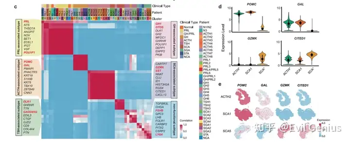 基于转录谱的相关性聚类分析,根据标志性基因将所有肿瘤细胞cluster注释为六个主要的转录类别:PRL相关型、GH相关型、ACTH相关型、SCA相关型、TSH相关型以及其他非功能性腺瘤相关亚型。相同谱系的肿瘤显示出更高的转录相似性并倾向于聚集,其中大多数PIT1谱系细胞cluster(PRL相关型、GH相关型以及GH/PRL相关型)表现出强相关性。值得注意的是,属于PIT1谱系的TSH分泌腺瘤与其他非功能性PitNETs(如SGA)具有相似性,这表明TSH肿瘤相较于其他PIT1谱系肿瘤具有不同的发育轨迹。此外,无功能亚型之一的零细胞腺瘤(NCAs)虽然显示出与SGAs相似的转录组特征,但也表现出独特的分子特征,包括分化抑制基因HOPX以及肿瘤进展相关基因PLCG2和TCN2的表达升高。这些独特的分子特征可能是NCAs表现出更强侵袭性行为的原因。