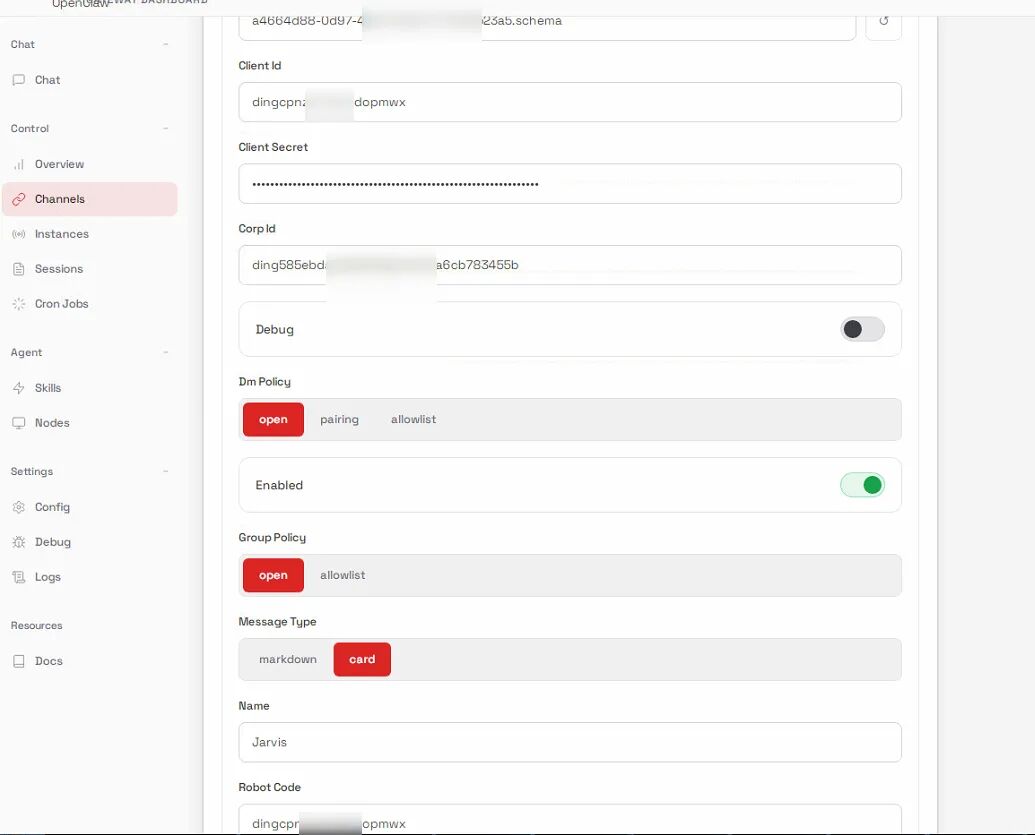 - 在OpenClaw控制台的Channel标签->Dingtalk配置面板-> Card Template Id填入